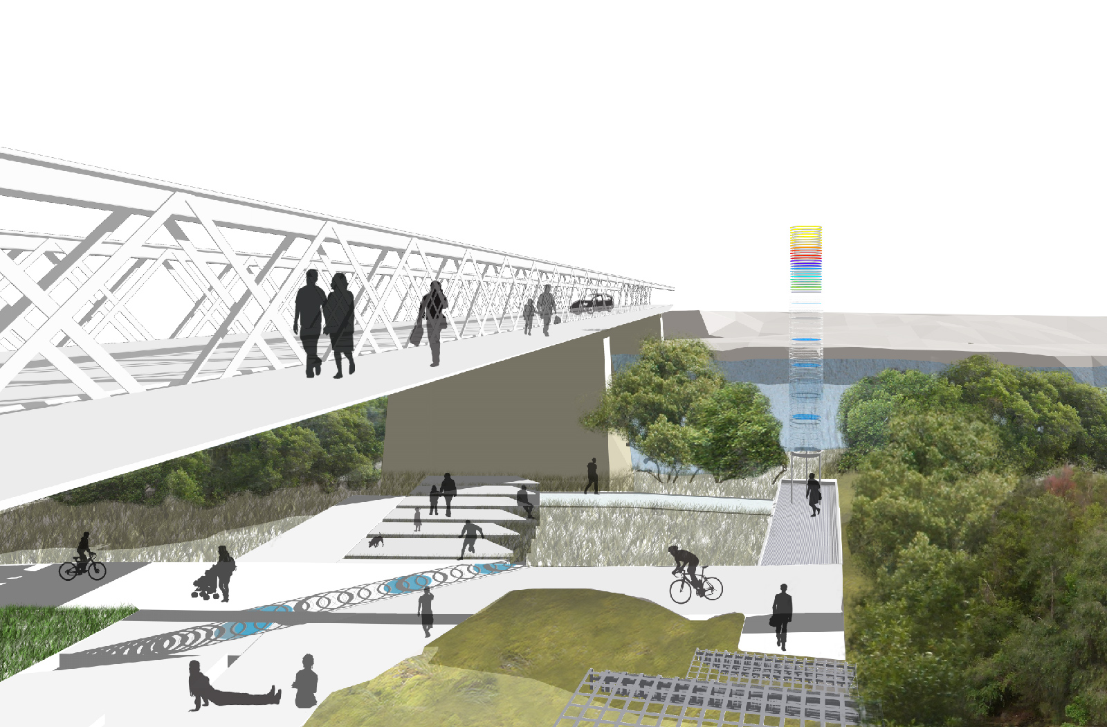 This project completes a crucial missing link to enable continuous pedestrian and cycle access from Western Sydney University at Rydalmere, through the city centre to Parramatta Park. From the new cycleway, The “Parrametre” marks a place where one may access the river or rest in the urban room created under the bridge. The last link of the landscaped-based project carries the path dramatically out over the river, in a curve and counter curve that will form a memorable city entry, adjacent to the river-cats from Circular Quay.