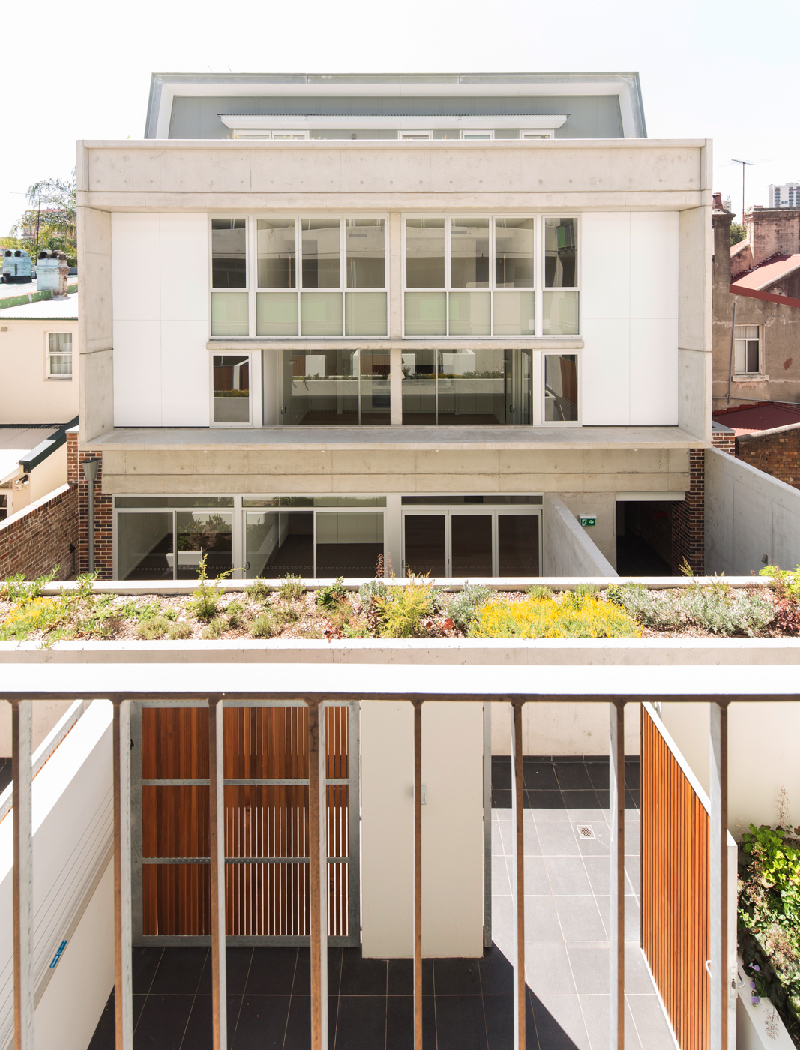 This project is sited on a complex block with four street frontages. Whilst there is a pedestrian entry on Bourke Street and a car entry off a side street, the primary 50 metre long frontage is to the Eastern Distributor. The acoustic and sensory challenge has driven the design diagram, whereby a double wall containing the services, common circulation, bathrooms and kitchens creates an acoustic buffer for the bedrooms and living areas, all of which open onto the protected courtyard within. Along Bourke Street, the frontage provides a more urbane street address, through a retained heritage facade.