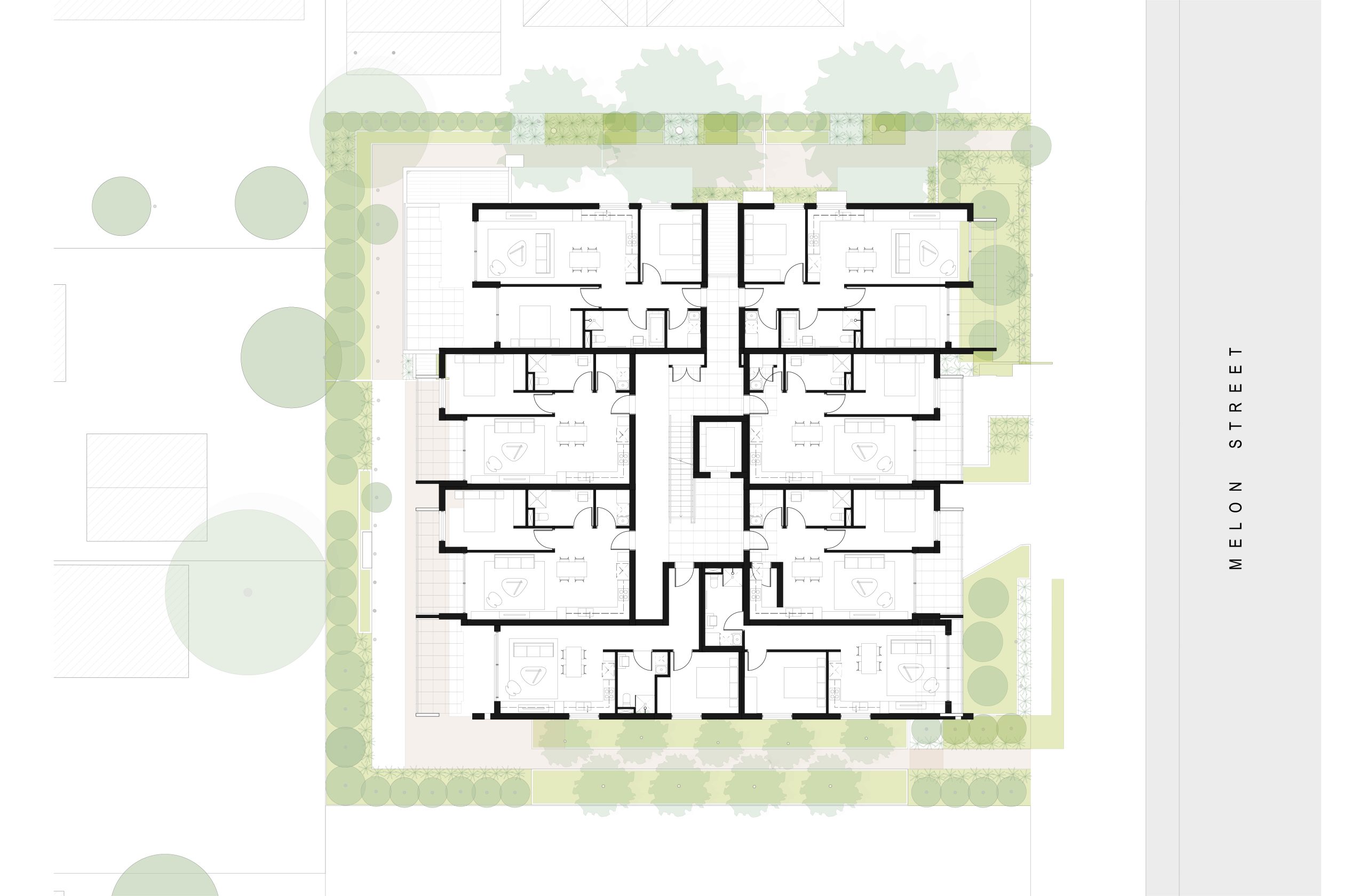 The building has been designed with a garden-led approach. Landscaping on all boundaries of the site facilitates a level of openness to the side and rear of the site and provides a pleasing aspect to the street. All street trees will be retained in order to maintain the existing streetscape, and carparking will be contained under the building form. The overall garden area is approximately 36.6% of the site.