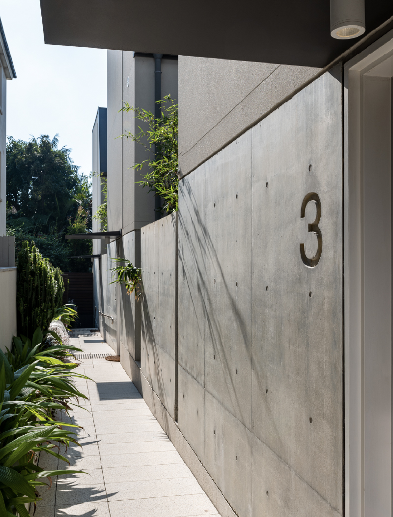 The whole development sits over a carpark. A concrete plinth with white render above creates a unifying datum for the 3 buildings. Landscape provides an important foil to the highly defined spaces.