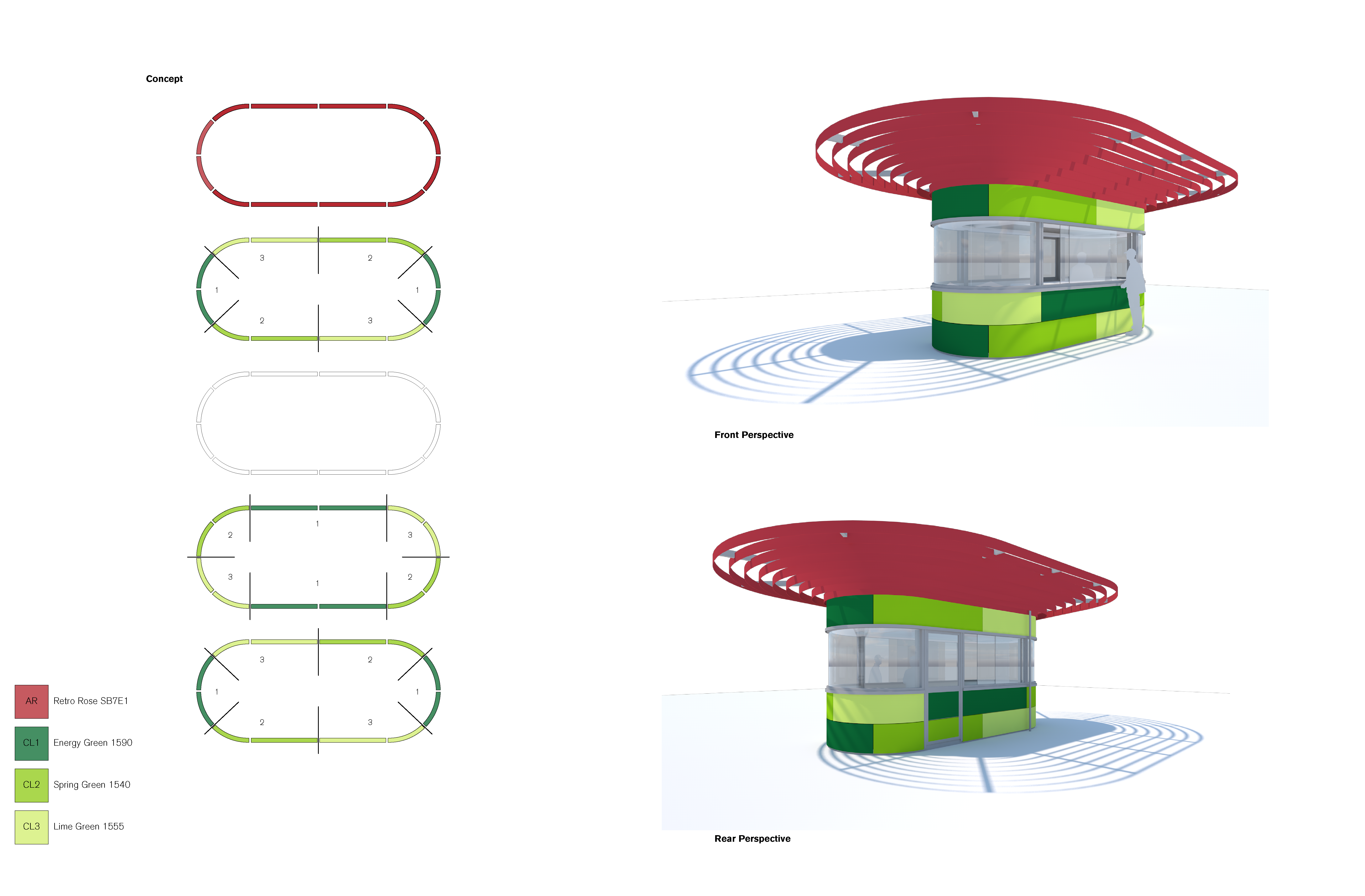 The existing graphic geometry of the track has been borrowed as a set out for all the primary elements, from carpark spaces to ticket booth awning, thus creating a unity and harmony to the park as a whole.