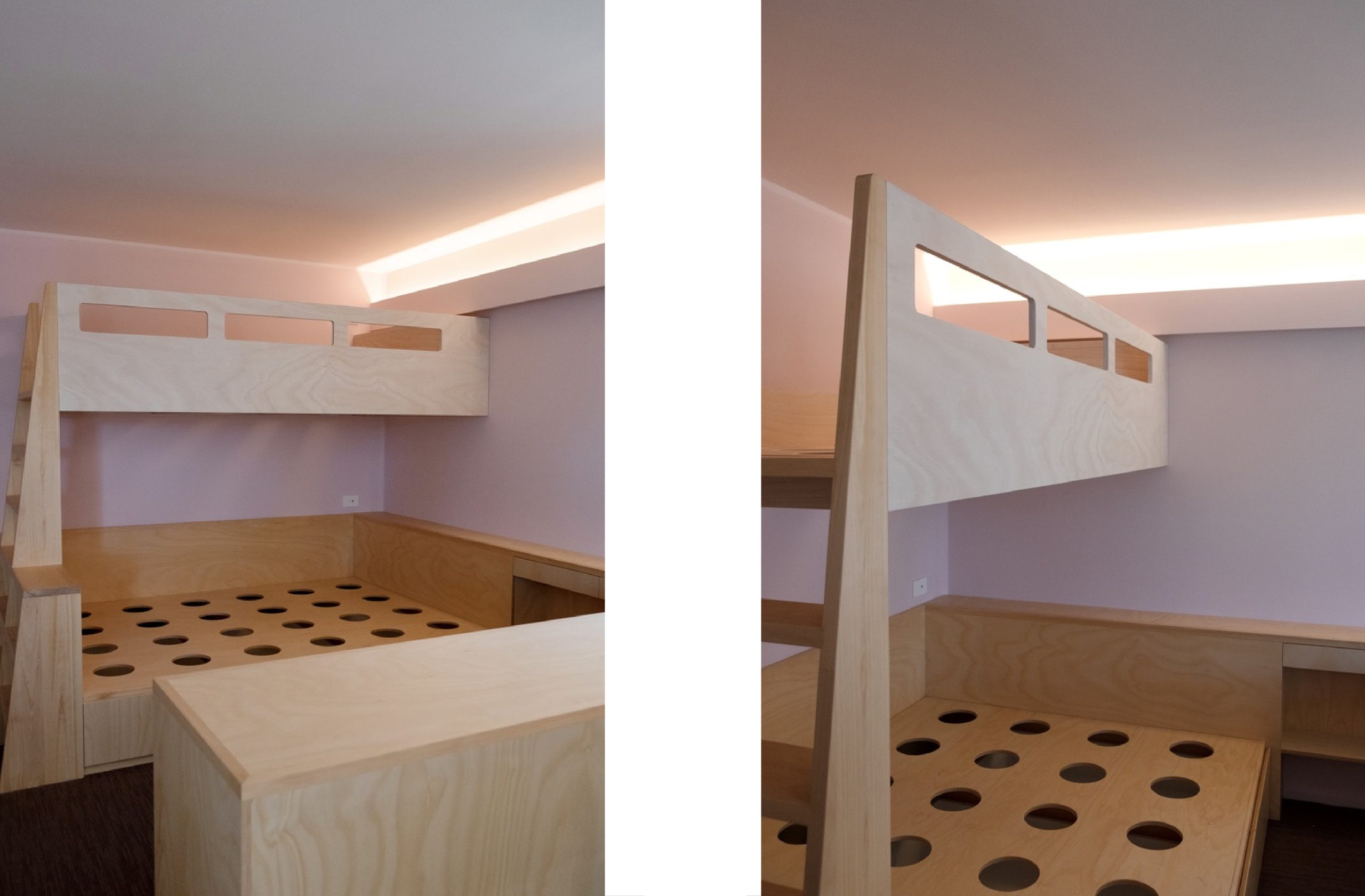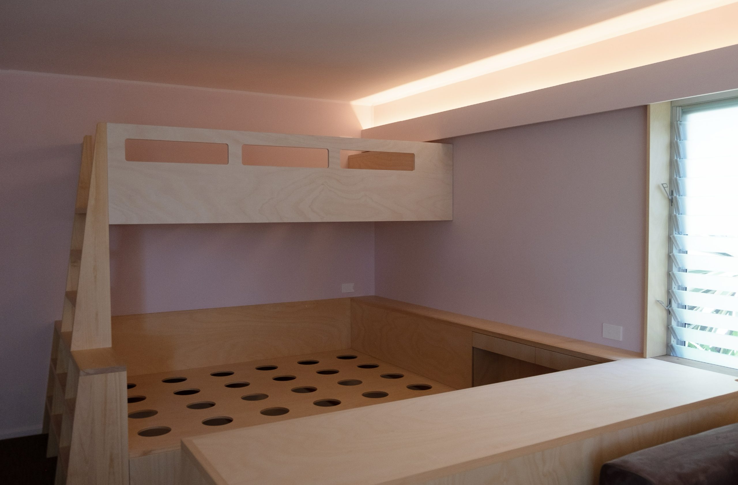 A pinkish room, made up of two pale tones, sets a soft scene for the light honey tones of Australian Hoop Pine ply and solid sections, sustainably grown up north. A bunk bed, with ladder access over a bookend bookshelf, incorporates a desk, drawers and a room-length side bench, creating a frame for a new orange couch to come.