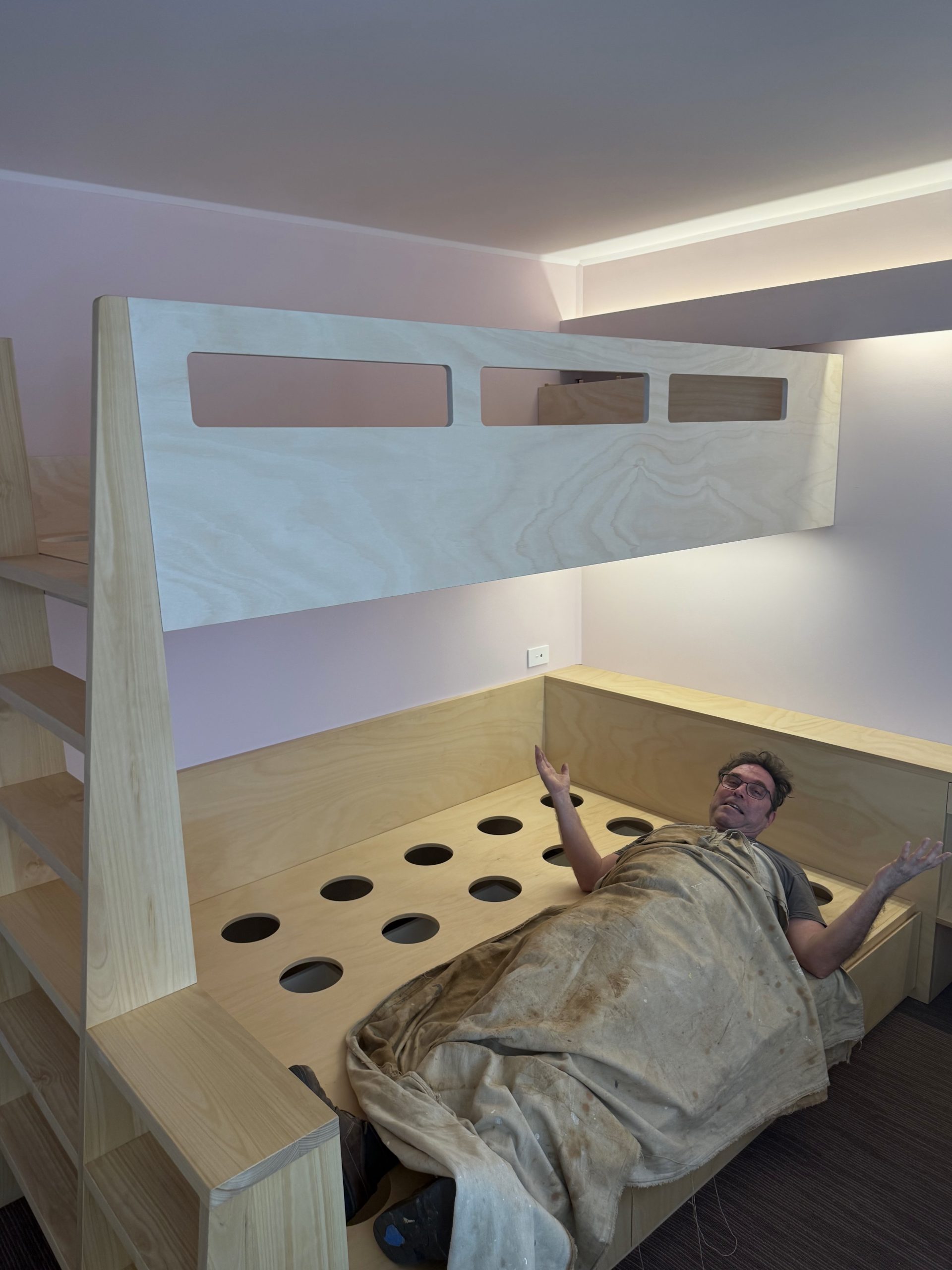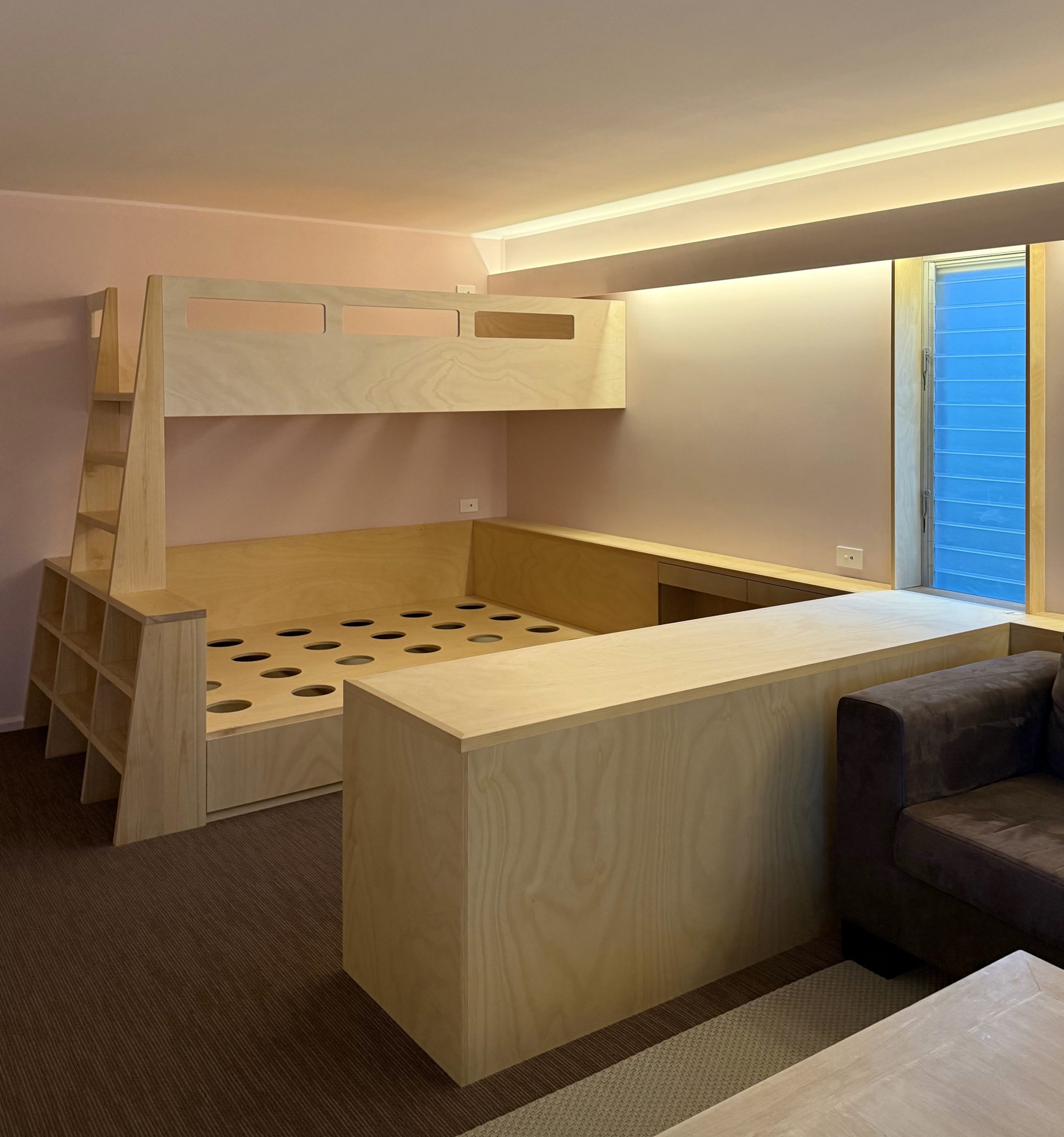 With thanks to Jeremy and Oscar, we have completed the second stage of our Whale Beach mini projects. A pinkish room, made up of two pale tones, sets a soft scene for the light honey tones of Australian Hoop Pine ply and solid sections, sustainably grown up north. A bunk bed, with ladder access over a bookend bookshelf, incorporates a desk, drawers and a room-length side bench, creating a frame for a new orange couch to come.